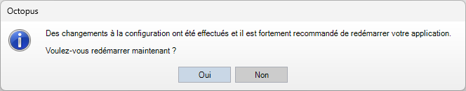 Lorsque des changements à la configuration étaient effectués (ex. : Gestion des données de référence, Options, Configuration des champs, ...), vous deviez impérativement redémarrer votre Octopus.
